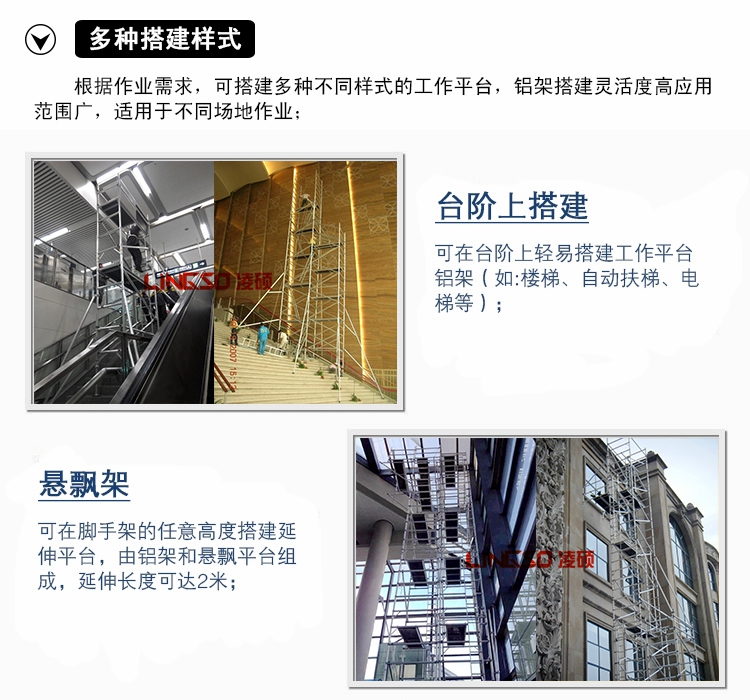 3、工作自由:防滑防水的工作平台,工作高度任意搭建;